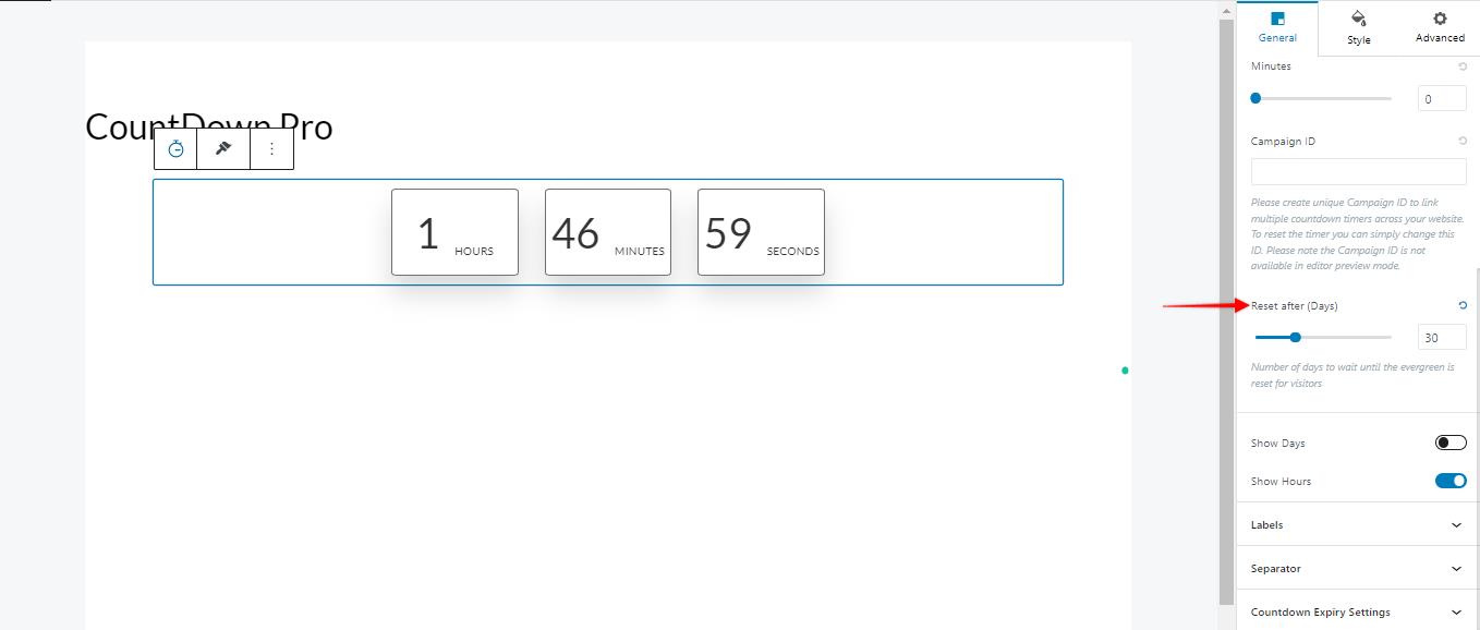 Step 6: You can select the number of days to wait until the evergreen timer is reset for visitors under the option “Reset After (Days)”. For example, if you set the reset after days to 30 days, the user will see the same countdown 30 days after the previous one expires.
