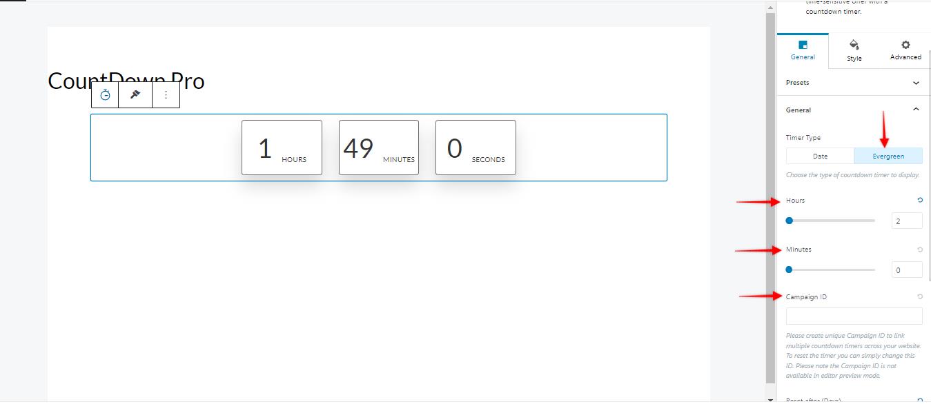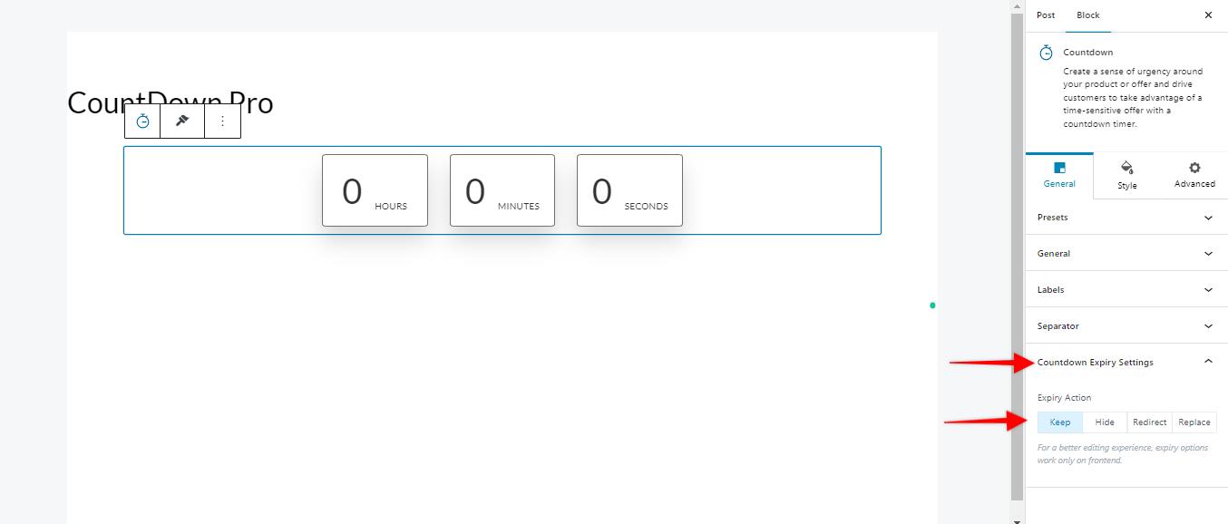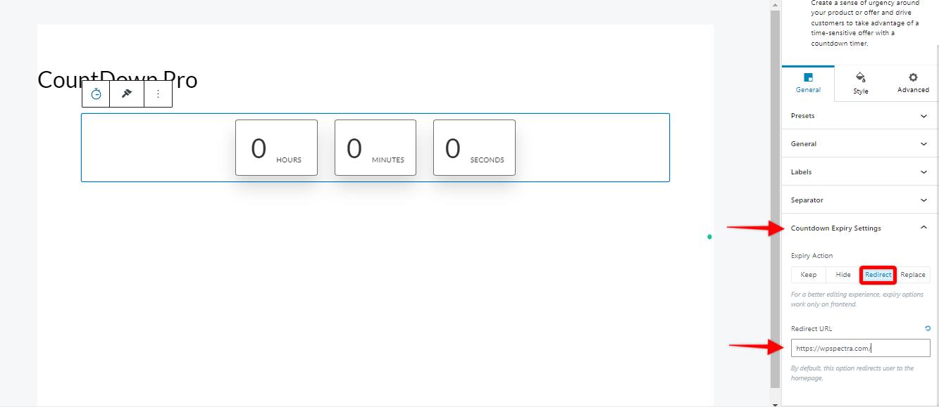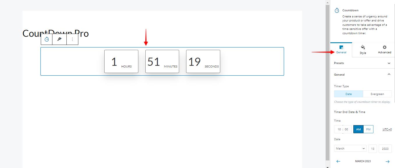 Step 2: Once you have activated the Spectra Pro plugin, please add the Countdown block on your website and navigate to the general settings under the block settings.