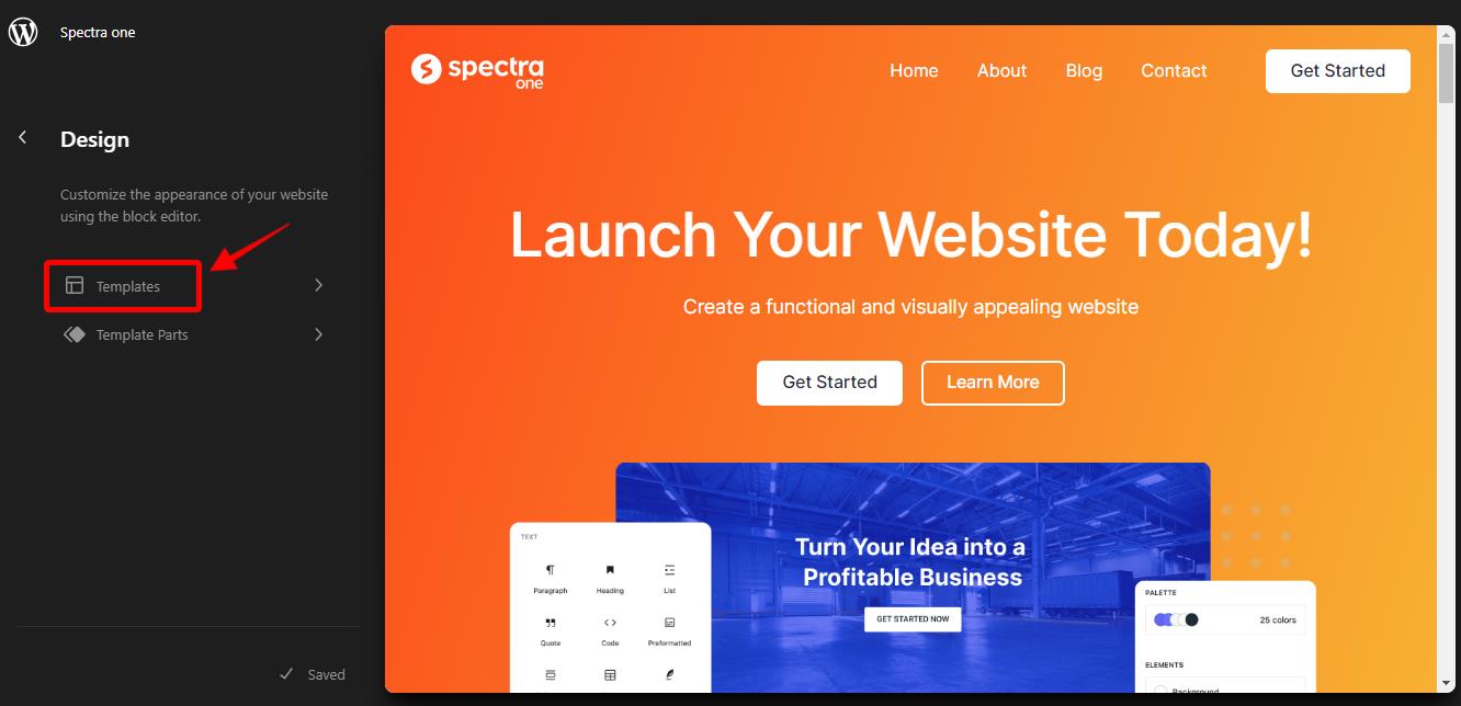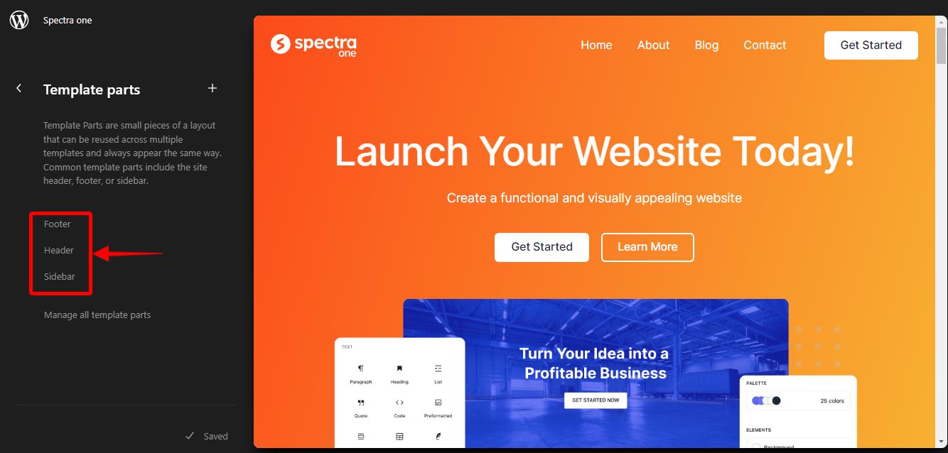 Full Site Editing also includes block-based page editing, where you can create dynamic and engaging content using pre-designed blocks. With the Spectra One theme, you’ll have access to a wide range of blocks that can be easily customized to match your brand and design preferences. Click on any elements under the template parts option to edit the blocks inside the global elements.