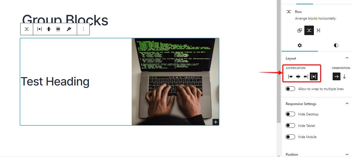 1. Justification: this option allows you to change the alignment of the blocks inside the group block. You can either position the blocks aligned to the left, right, or center or even create a space between them.
