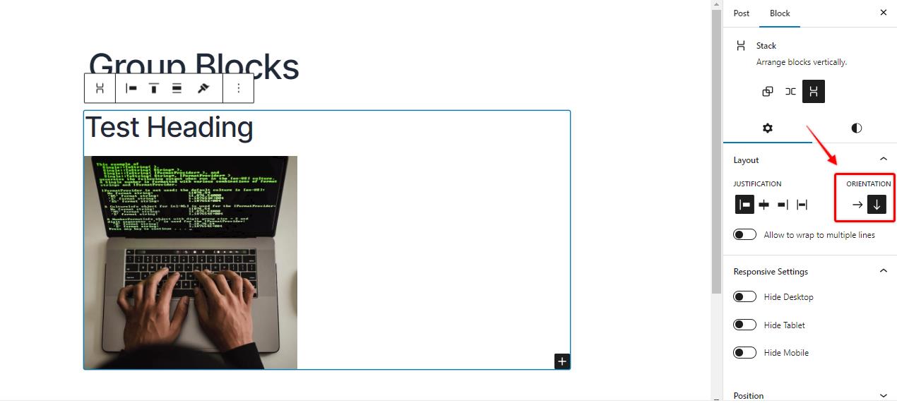 1. Orientation: The orientation option allows you to rearrange the blocks inside the group block as horizontal or vertical.