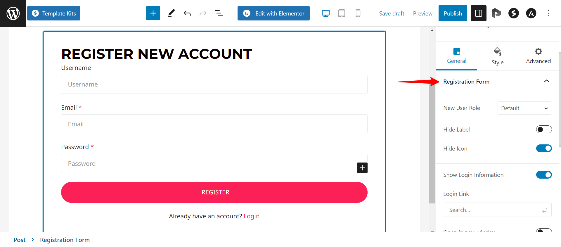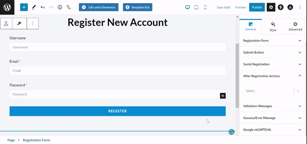 Step 2: Once enabled, go to Page/Post and drag and drop the Registration Form Block and you will see the default Form Fields.