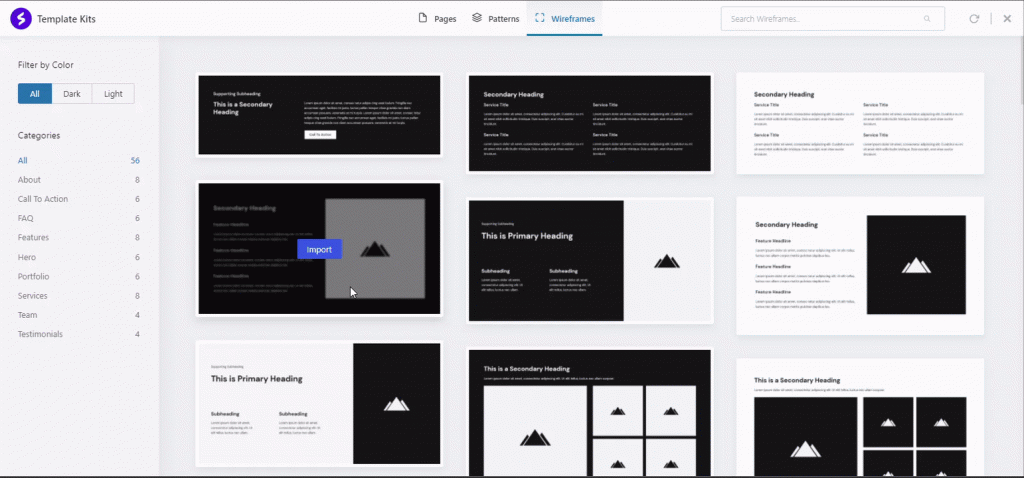 Step 3 – Here, you can filter the blocks by color and category and import the wireframe block to your page. You can do this by hovering over the block you need and clicking on the “Import” button;