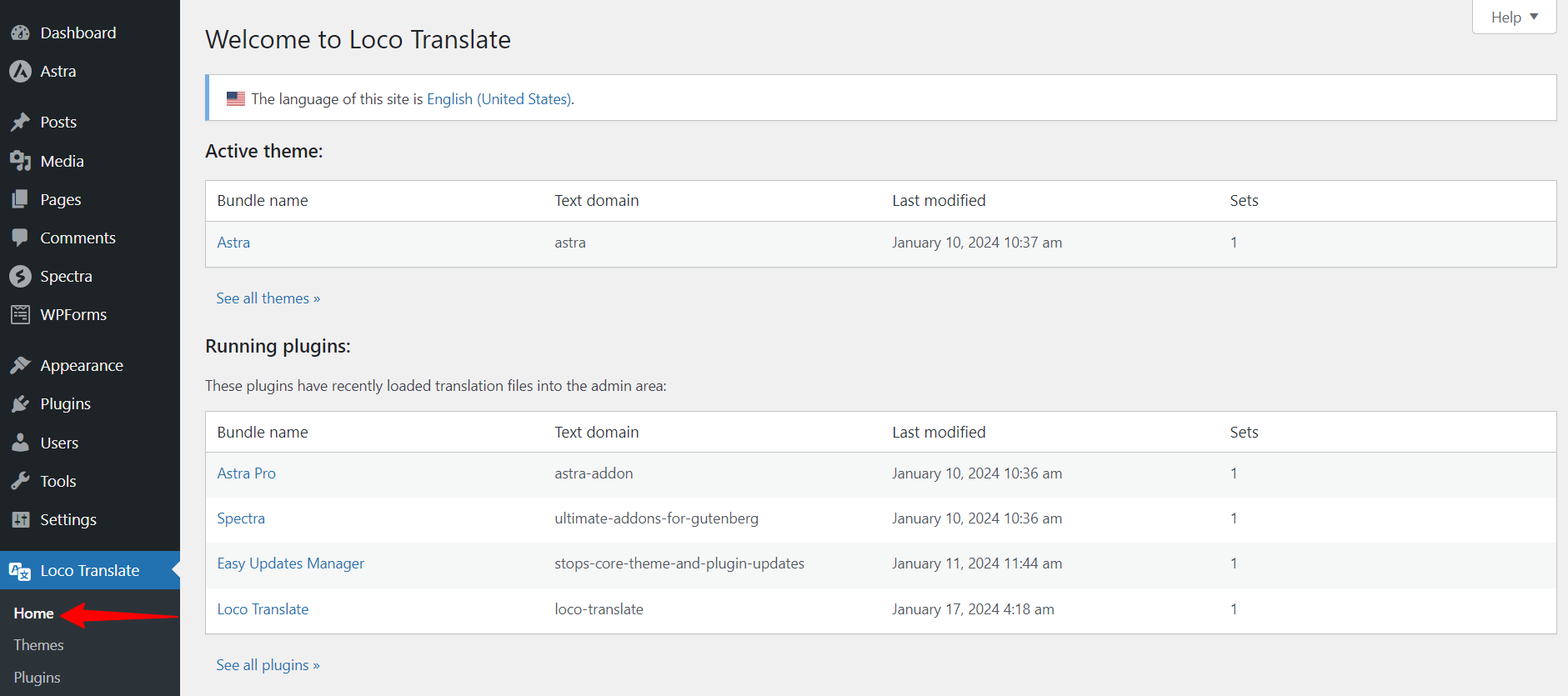 - From the WordPress dashboard, Navigate to Loco Translate > Home.